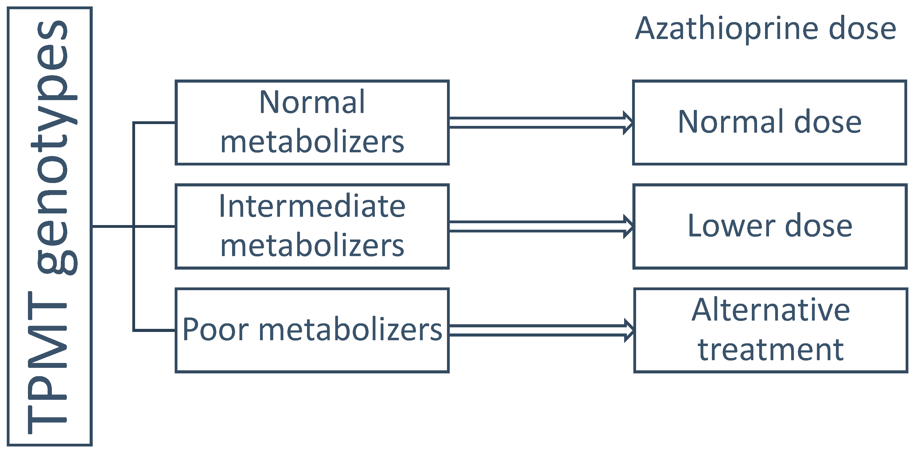 - Schwab, M.; Schäffeler, E.; Marx, C.; Fischer, C.; Lang, T.; Behrens, C.; Gregor, M.; Eichelbaum, M.; Zanger, U.M.; Kaskas, B.A.; et al. Azathioprine therapy and adverse drug reactions in patients with inflammatory bowel disease: Impact of thiopurine S-methyltransferase polymorphism. Pharmacogenetics 2002, 12, 429–436. [Google Scholar] [CrossRef]