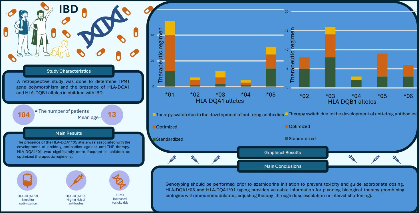 Pharmacogenetics represents a key step toward the development of personalized therapy. The goal of any long-term treatment is to maximize therapeutic efficacy using the lowest effective dose, thereby improving quality of life, reducing disease burden, and minimizing adverse effects. TPMT genotyping should be performed prior to azathioprine initiation to prevent toxicity and guide appropriate dosing. Given the risk of anti-drug antibody formation, as seen in our research, HLA-DQA1*05 and HLA-DQA1*01 typing provides valuable information for planning biological therapy, including decisions about combining biologics with immunomodulators or adjusting therapy through dose escalation or interval shortening.