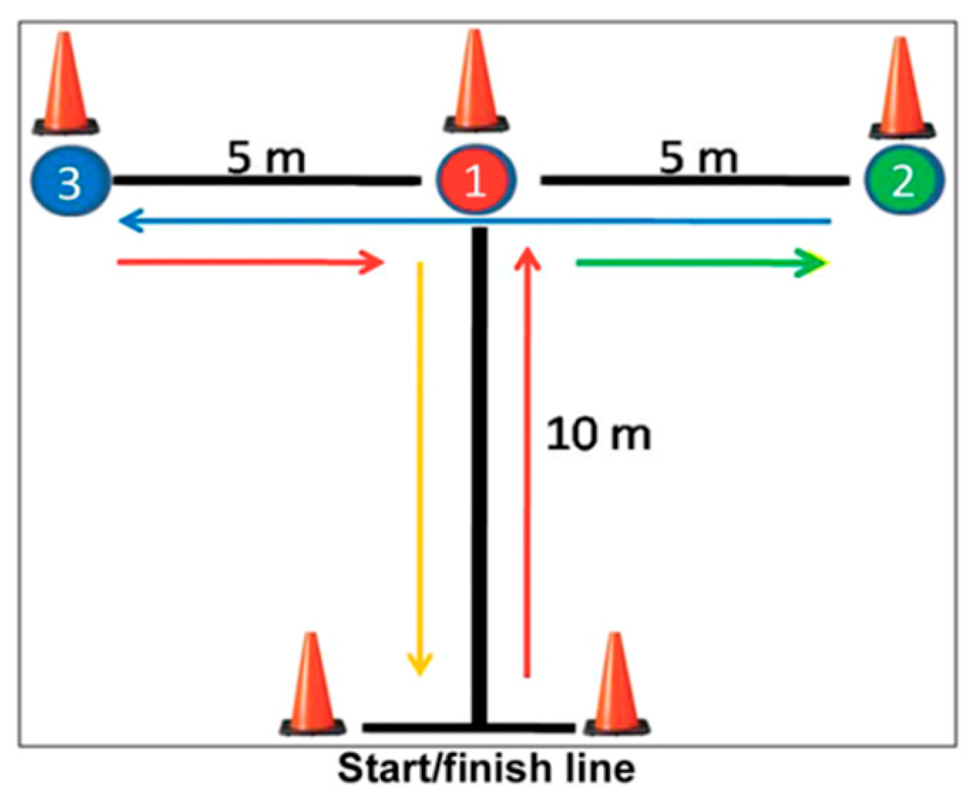 - Pauole, K.; Madole, K.; Garhammer, J.; Lacourse, M.; Rozenek, R. Reliability and validity of the T-test as a measure of agility, leg power, and leg speed in college-aged men and women. J. Strength Cond. Res. 2000, 14, 443–450. [Google Scholar] [CrossRef]