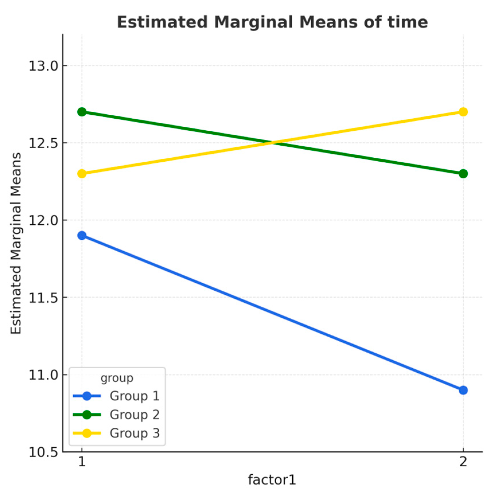 3.3. Repeated Measures ANOVA: Pretest–Posttest Evolution in the Three Groups for Motor Variables and Psychological Indicators