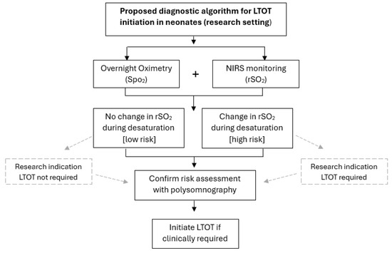 With the impact of IH on later neurodevelopmental outcome in the late-preterm and term newborn as the primary driver for investigation and subsequent management, a brain-oriented approach to its diagnosis and management seems logical. Adjunctive cerebral tissue oxygenation may complement pulse oximetry for the purpose of overnight oximetry testing. Pulse oximetry does not reflect regional tissue oxygenation at the cerebral level, and NIRS is known to reliably measure dynamic changes in cerebral tissue oxygen saturation faster than SpO2 [98]. Further, there is already evidence for its utility as part of gold-standard polysomnography studies. For example, in paediatric patients undergoing investigation for sleep apnoea, when the commonly used apnoea/hypopnea index was calculated using NIRS-derived rSO2, it was greater than that calculated using SpO2, suggesting that NIRS does have potential as a valuable adjunct in the assessment of patients with IH [99]. Thus, current diagnostic and treatment approaches to ensure adequate cerebral oxygenation, and by inference normal neurodevelopment, in late-preterm and term newborns with IH may be more accurately achieved through the adjunctive use of NIRS. A proposed diagnostic algorithm for LTOT initiation in neonates in a research setting is listed below in Figure 1. To assess the feasibility of NIRS monitoring to accurately predict an infant’s oxygen needs, we propose adjunctive overnight oximetry and NIRS monitoring. Infants who demonstrate no change in rSO2 during desaturation events defined by SpO2 would be classified as “low risk”, and LTOT may not be indicated under this hypothesis. Conversely, infants who demonstrate reductions in rSO2 during desaturation defined by SpO2, may be at higher risk and therefore more likely to require LTOT. Final risk assessment and LTOT requirement would be confirmed by polysomnography.
