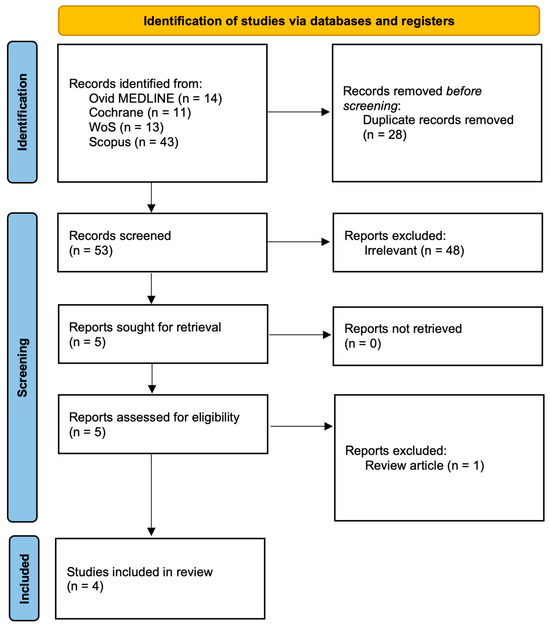 We performed a comprehensive literature search in Ovid MEDLINE, Scopus, Web of Science, and the Cochrane Library to identify studies investigating salivary biomarkers in pediatric acute appendicitis. The last search was conducted on 17 September 2025. The search combined MeSH terms and free-text terms related to saliva/salivary, appendicitis/appendectomy, and pediatric populations (including children, adolescents, infants, and pediatric/paediatric terminology) incorporating Boolean operators (AND, OR) to refine the results. Searches were limited to the English language but not limited regarding date restrictions. Titles and abstracts were independently screened by two reviewers (Z.P., I.M.) according to predefined eligibility criteria. Studies were included if they: (i) involved patients under 18 years of age, (ii) assessed salivary biomarkers in the context of suspected or confirmed acute appendicitis, and (iii) reported original clinical data. Additionally, reference lists of all included studies and relevant reviews were screened manually to identify further eligible publications (Figure 1).