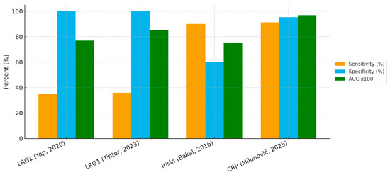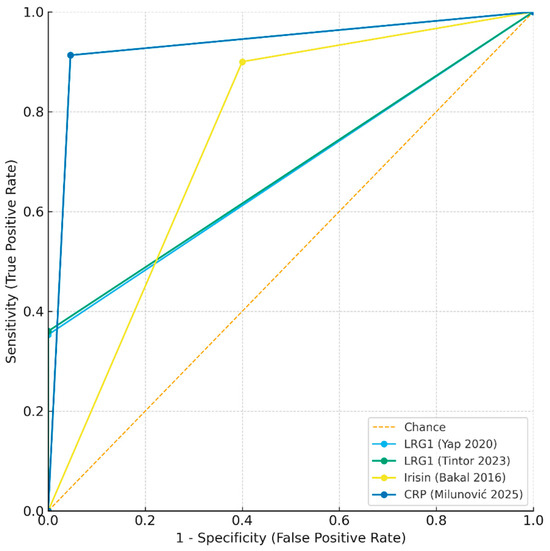 The approximate ROC curves (Figure 3) demonstrate the superior overall discriminatory ability of CRP compared with LRG1 and irisin. Collectively, these findings suggest that single-marker strategies may be insufficient, and that future work should prioritize multi-marker salivary panels, potentially combining the high specificity of LRG1 with the high sensitivity of CRP or irisin, to maximize diagnostic performance.