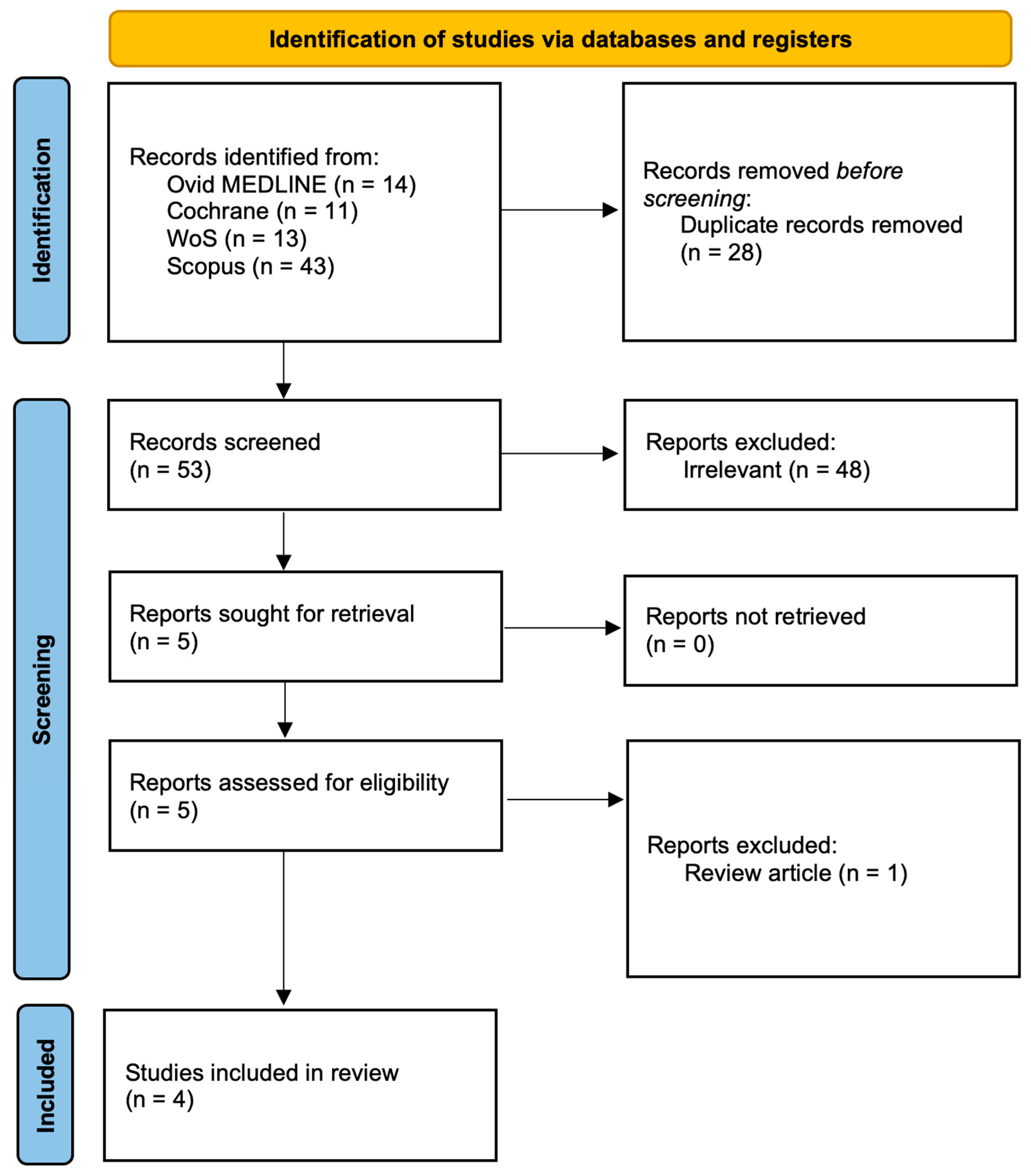 We performed a comprehensive literature search in Ovid MEDLINE, Scopus, Web of Science, and the Cochrane Library to identify studies investigating salivary biomarkers in pediatric acute appendicitis. The last search was conducted on 17 September 2025. The search combined MeSH terms and free-text terms related to saliva/salivary, appendicitis/appendectomy, and pediatric populations (including children, adolescents, infants, and pediatric/paediatric terminology) incorporating Boolean operators (AND, OR) to refine the results. Searches were limited to the English language but not limited regarding date restrictions. Titles and abstracts were independently screened by two reviewers (Z.P., I.M.) according to predefined eligibility criteria. Studies were included if they: (i) involved patients under 18 years of age, (ii) assessed salivary biomarkers in the context of suspected or confirmed acute appendicitis, and (iii) reported original clinical data. Additionally, reference lists of all included studies and relevant reviews were screened manually to identify further eligible publications (