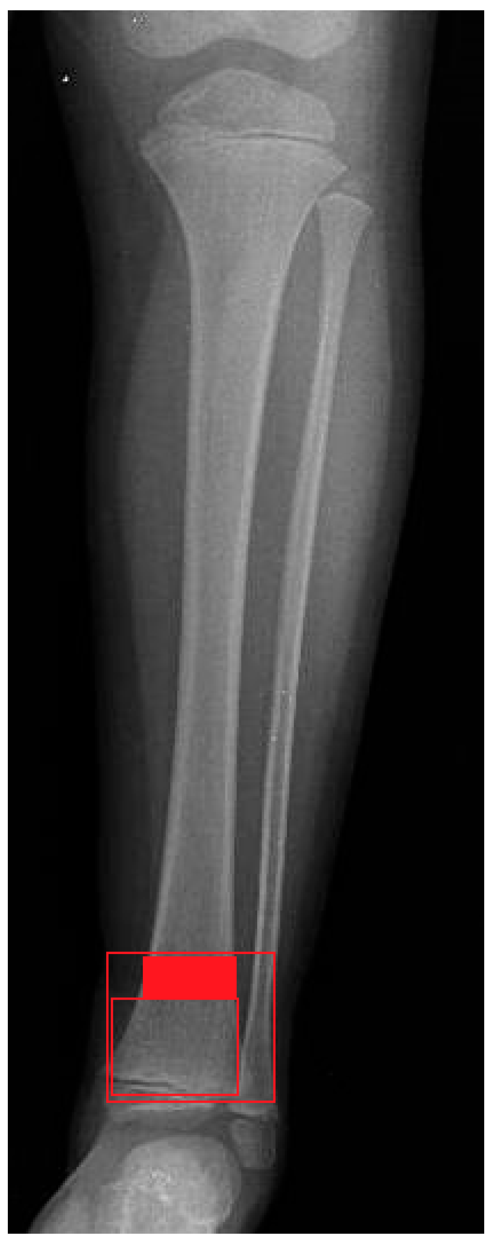 DDMJ is delineated according to “The AO Pediatric Comprehensive Classification of Long Bone Fractures,” wherein the metaphyseal region is represented by a rectangle encompassing the base of the growth plate of both the distal tibia and fibula (the large square at the distal tibia and fibula). Additionally, a smaller square is positioned adjacent to the tibial epiphysis, with a height equivalent to the broadest section of the tibial epiphysis. The region of the distal tibia located between two squares is designated as the DDMJ [14,15] (Figure 1).