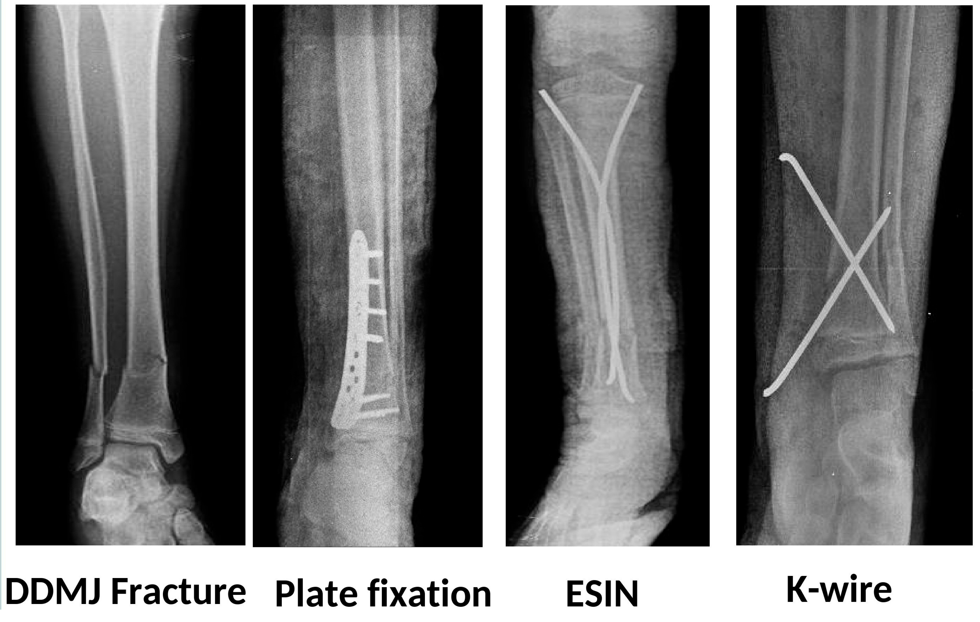 The objective of this study was to compare the clinical and radiological outcomes of ESIN, plate, and K-wire fixation in pediatric unstable tibial DDMJ fractures; it focused on postoperative alignment, functional recovery based on the American Orthopedic Foot and Ankle Society (AOFAS) score, complication rates, and treatment costs.