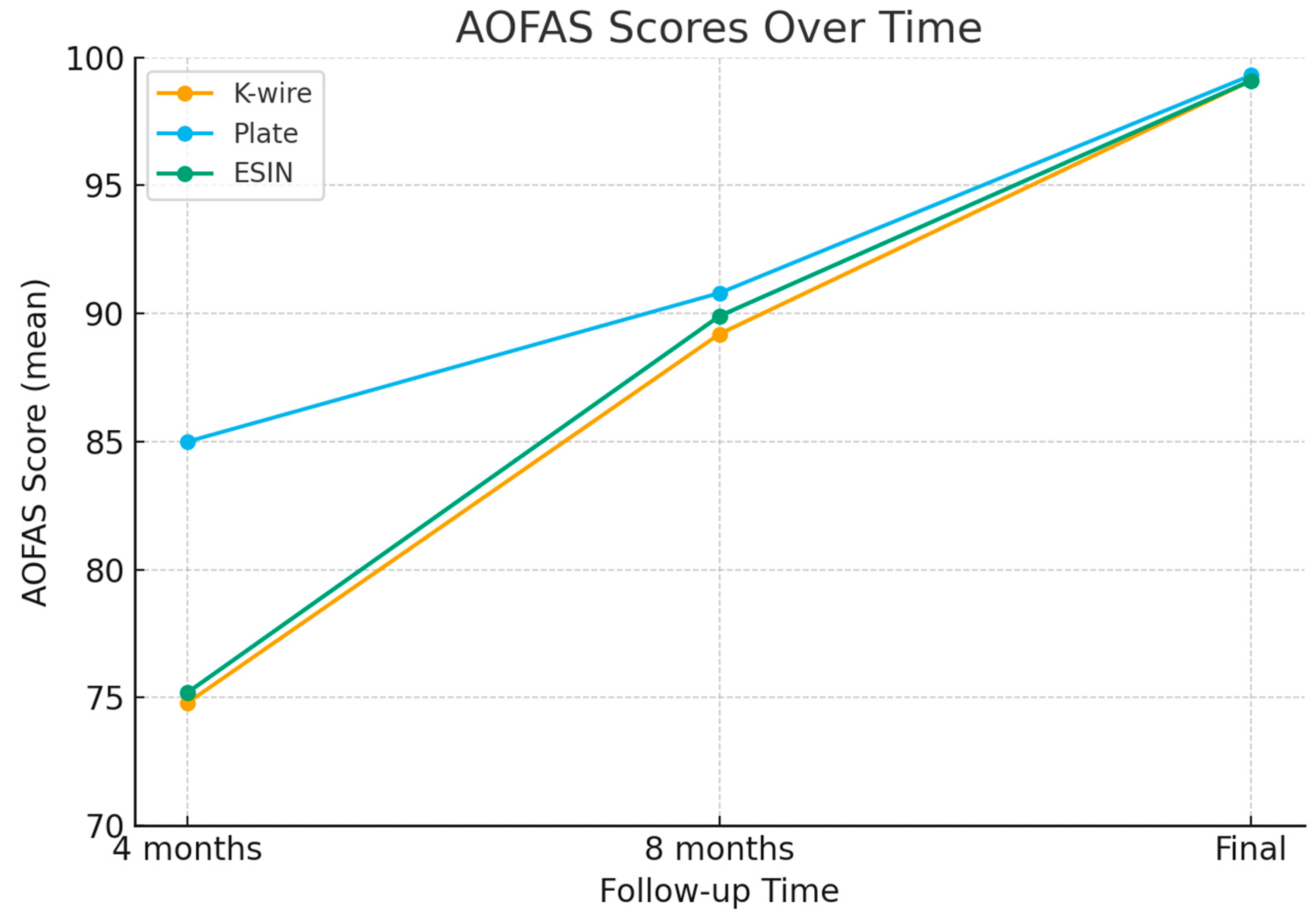 In the literature, it has been emphasized that plate osteosynthesis provides better angular stability, making it a suitable option, since it offers the possibility of earlier mobilization and better functional outcomes [13]. The ESIN method is a well-known method with specific indications, and satisfactory clinical results can be achieved when performed in accordance with the rules [34,35]. Although K-wire fixation is less stable compared to other methods, it can provide good clinical results with minimal soft tissue damage and low complication rates [11,20,21]. In our study, AOFAS scores were significantly better in the first 4-month follow-up in the plate group compared to the other groups. There was no statistically significant difference in the AOFAS scores among the groups at the 8th month and final follow-up. In a study conducted by Thabet et al. on skeletally immature patients, no significant difference was found between ESIN, interlocking nail, plate, external fixation, and casting in terms of recovery and complications [32].