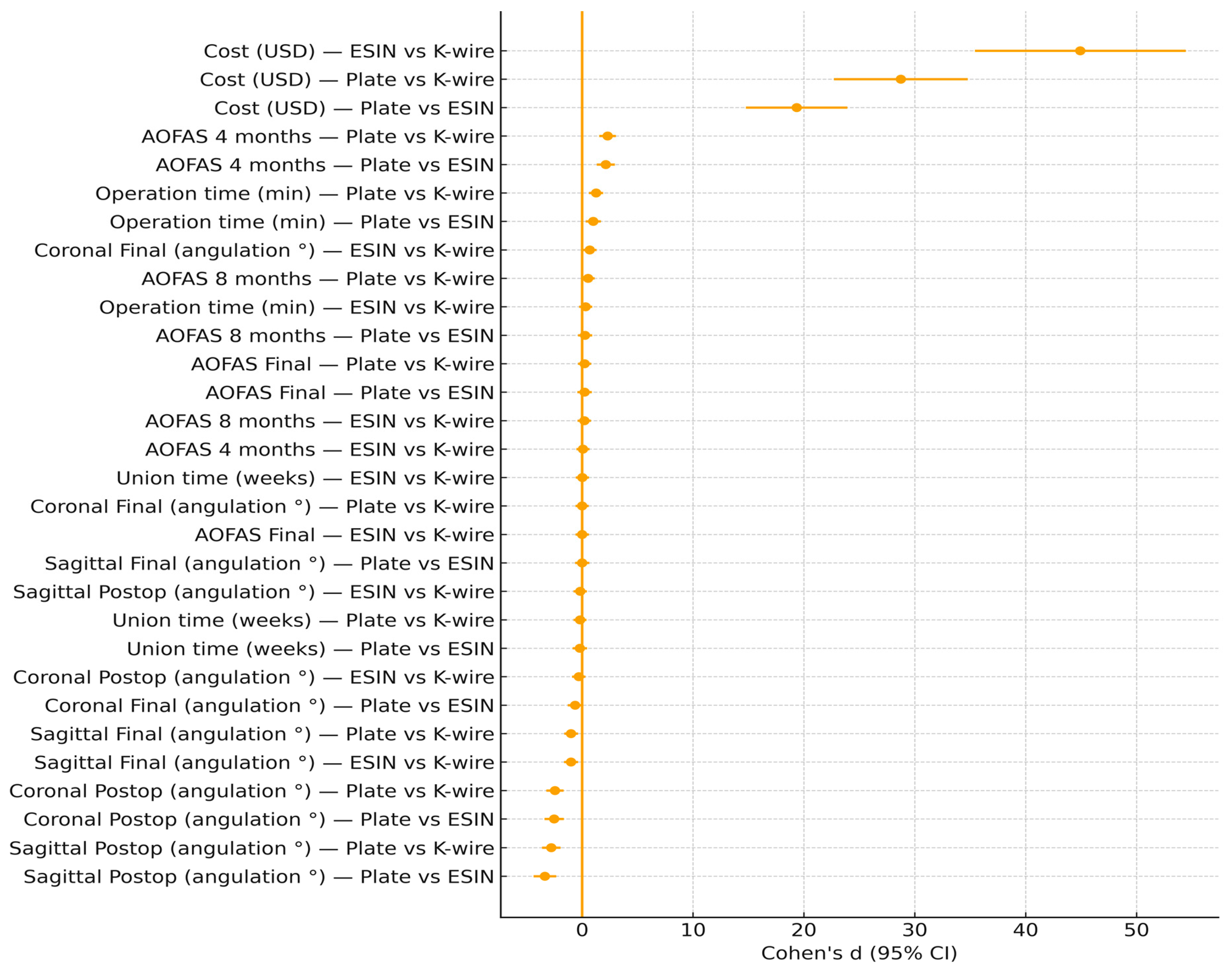 Our effect size analysis provides additional insight into the clinical relevance of the findings (Figure 4). Union time demonstrated negligible differences across fixation methods (Cohen’s d ≤ 0.2), confirming that healing potential in pediatric patients is independent of implant choice. In contrast, operation time revealed large effects, with plate fixation requiring approximately 20–26 min longer than ESIN or K-wire. This difference is not only statistically significant but also clinically relevant in the context of anesthesia exposure and operating room efficiency. Cost analysis further highlighted large absolute mean differences, with plate fixation being nearly twice as expensive as ESIN and more than three times as costly as K-wire, underscoring the economic implications of implant choice. Functional outcomes measured by AOFAS showed a moderate effect size favoring plates at 4 months, reflecting faster early recovery, but these advantages disappeared by final follow-up as remodeling and rehabilitation equalized outcomes across groups. Radiographic outcomes similarly demonstrated large postoperative effect sizes favoring plate fixation for coronal and sagittal alignment, yet these differences became trivial at consolidation, confirming the strong remodeling capacity of the pediatric tibia. Taken together, these findings suggest that while plates may provide superior early alignment and functional recovery, their higher operative burden and cost must be weighed against the equally effective long-term outcomes of ESIN and K-wire fixation.