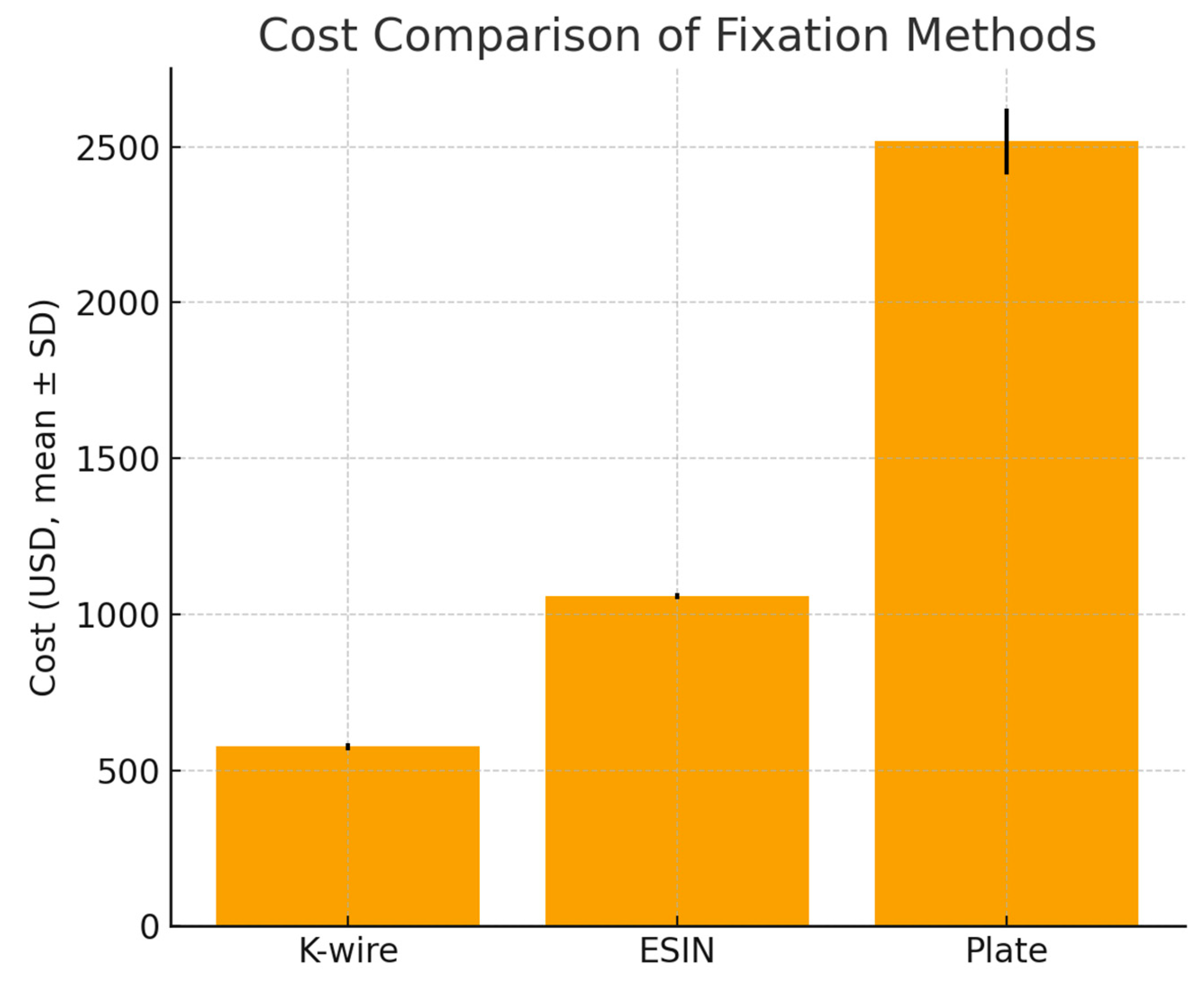 ESIN has gained widespread acceptance thanks to its minimally invasive nature, benefits of early mobilization, and particularly excellent functional outcomes in diaphyseal fractures [8,9,10]. However, its application in distal metaphyseal regions remains technically challenging due to the short distal fragment and proximity to the physis. Plate fixation provides rigid anatomical stabilization at the cost of extensive soft tissue dissection, while K-wire fixation remains biomechanically weaker in controlling translation and angulation [11,12,13]. In addition to clinical and radiographic outcomes, we analyzed the economic aspects of treatment, as implant selection has significant implications for healthcare systems. While functional recovery may converge over time, differences in implant cost, operative duration, and hospital stay represent a relevant burden for both families and healthcare providers.