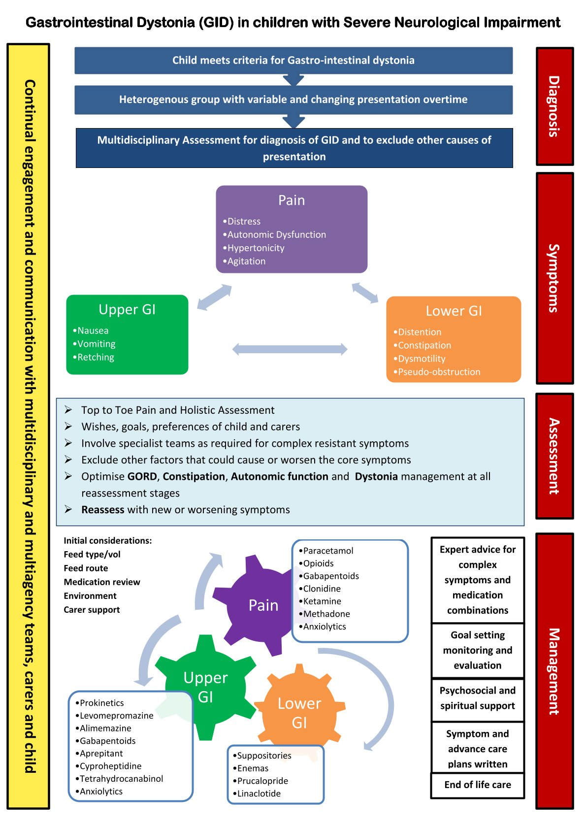 - Ensure optimal management of gastro-oesophageal reflux, spasticity, muscular dystonia, secretions, and constipation prior to treatment directed at gastrointestinal dystonia (consensus view of study development group) [21]. Children with severe neurological impairment often have multiple sources of pain and distress [26,29]. These should be fully assessed and excluded or treatment optimised prior to treatment directed specifically at gastrointestinal dystonia (consensus view of study development group). If hip or spine pain, spasticity, or gastroesophageal reflux disease is poorly controlled, management of gastrointestinal dystonia will likely be ineffective as significant triggers for pain and distress remain unaddressed.