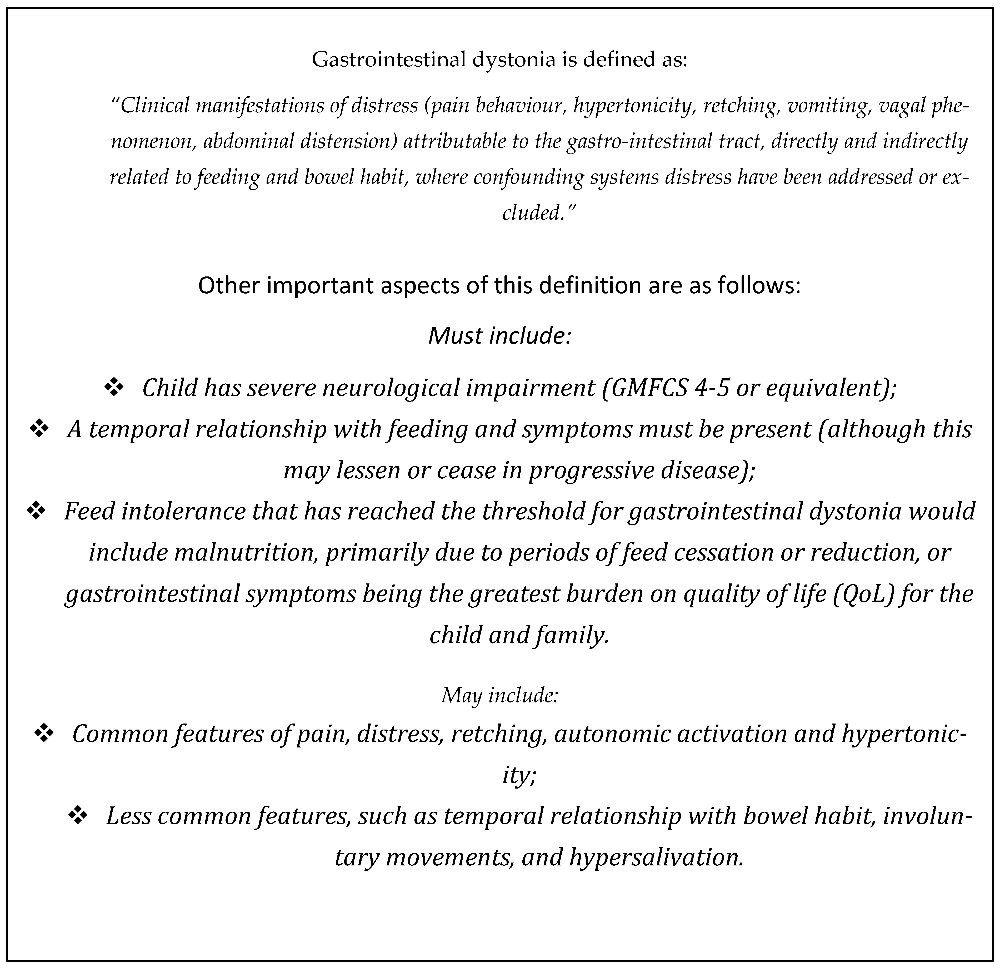 - Barclay, A.; Meade, S.; Richards, C.; Warlow, T.; Lumsden, D.; Fairhurst, C.; Paxton, C.; Forrest, K.; Mordekar, S.; Campbell, D.; et al. O13 Working definition of gastrointestinal dystonia of severe neuro-disability; outcome of the BSPGHAN/BAPM/BAPS/APPM/BPNA appropriateness panel. Frontline Gastroenterol. 2022, 13, A9–A10. [Google Scholar] [CrossRef]