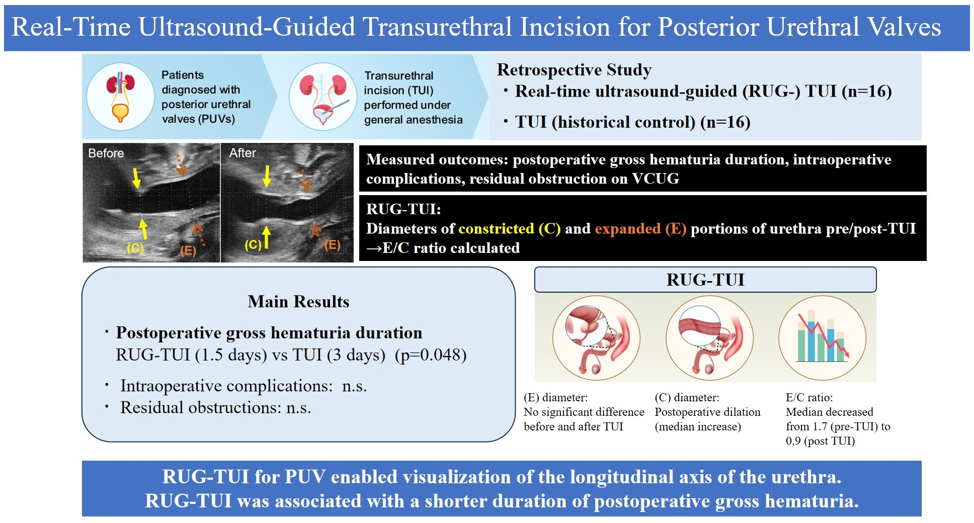 To the best of our knowledge, this single-center, retrospective feasibility study with a cohort design using historical controls is among the first to describe RUG-TUI for PUV in children. This procedure combines ultrasound and urethroscopy, enabling the visualization of the longitudinal axis of the urethra and facilitating easy assessment of the anatomical relation of the stenosis and external urethral sphincter. Furthermore, our results suggest that RUG-TUI may reduce the duration of postoperative hematuria and facilitate an accurate evaluation of treatment effectiveness during the procedure on a real-time basis.