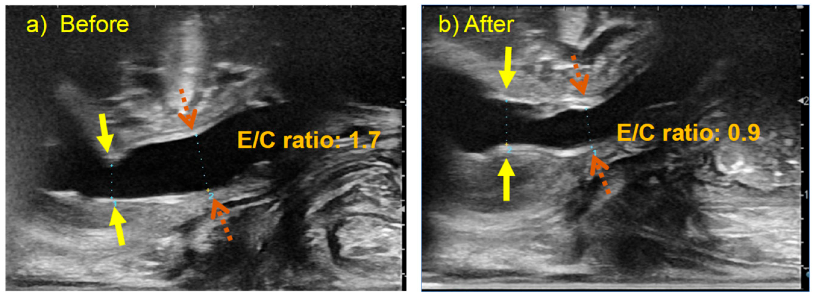 Our study has some limitations that should be considered. First, this was a single-center, retrospective observational study. Due to the small sample size and use of historical controls, potential confounding factors such as patient background characteristics and differences between surgical operators cannot be ruled out. Second, postoperative evaluation was performed using only VCUG. Neither urodynamics nor uroflowmetry was used to assess urinary function, which may have provided more comprehensive information on the treatment efficacy. Third, the long-term outcomes of this procedure, such as kidney function and the frequency of urinary tract infections, remain unclear due to the limited follow-up period and require further investigation. Fourth, urethral ultrasonography is an operator-dependent modality, and variability related to probe pressure or technique may affect the accuracy of measurements. Although the E/C ratio was used to minimize these effects, intra- and interobserver variability was not assessed in this study. As this was an exploratory feasibility study, further research is needed to confirm the reproducibility and objectivity of this method.