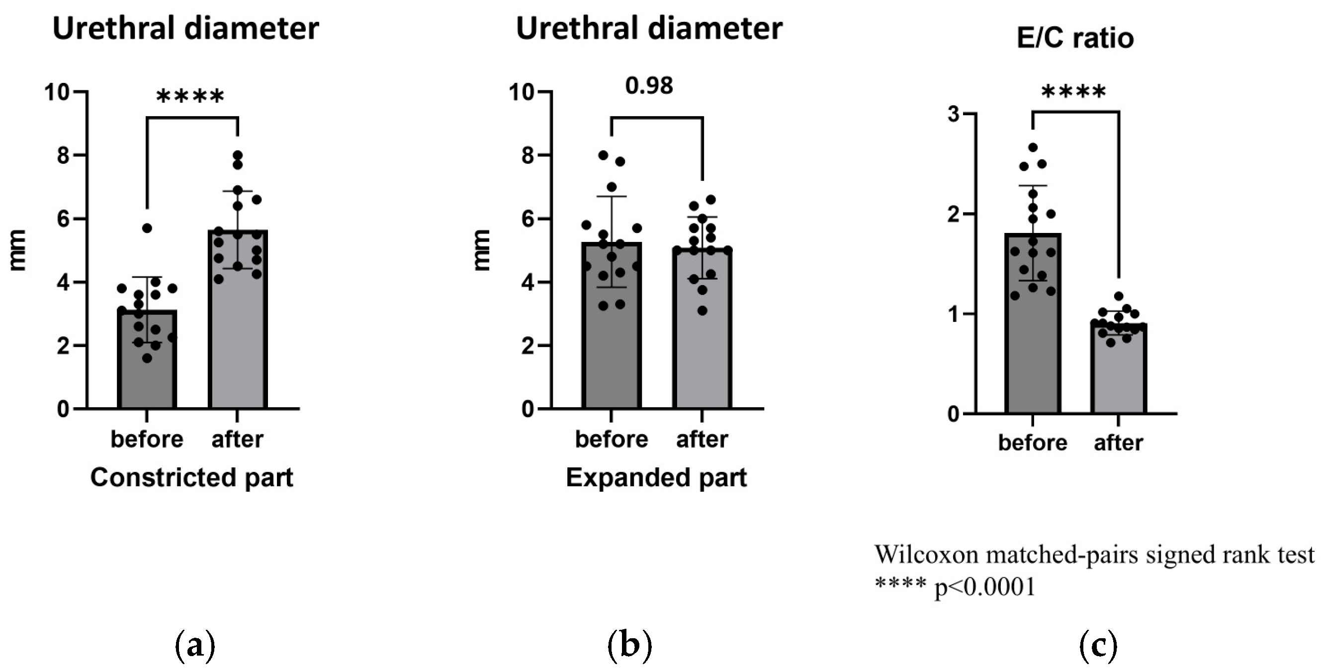 Furthermore, the diameters of the C and E segments of the urethra before and after RUG-TUI were compared. The median preoperative diameters of the E and C segments of the urethra were 5.0 mm (range, 3.3–8.0 mm) and 3.1 mm (range, 1.6–5.7 mm), respectively, with a median E/C ratio of 1.7 (range, 1.2–2.7). The median postoperative diameters of the E and C segments of the urethra were 5.0 mm (range, 3.1–6.6 mm) and 5.5 mm (range, 4.1–8.0 mm), respectively, with a median E/C ratio of 0.9 (range, 0.7–1.2). The diameter of the C segments and the E/C ratio revealed a significant difference between the preoperative and postoperative measurements (