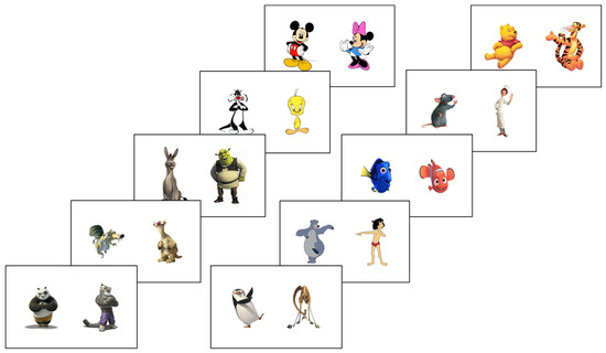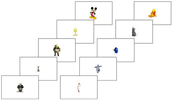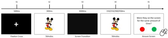 This task assessed visual sensory processing by evaluating temporal perception. The stimulus was a 10 cm visual image (e.g., Mickey Mouse) initially displayed for 300 ms. Upon reappearance, its duration varied (150 ms, 250 ms, 300 ms, or 450 ms). Participants compared the two durations across 40 trials. Figure 1 illustrates the procedure. All the used stimuli are presented in Figure 2.