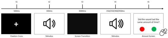 This task assessed auditory sensory processing by evaluating temporal perception. This task mirrored the visual task but used auditory stimuli (tones). Durations matched those in the visual task, and 40 randomized trials were conducted. Figure 3 represents the auditory task procedure. All the stimuli are presented in the Open Science Framework (OSF) repository [119].