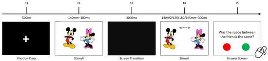 This task assessed visual sensory processing by evaluating spatial perception. Participants compared the distances between two 10 cm images. Initially separated by 140 mm, the reappearance distances varied (90 mm, 120.5 mm, 140 mm, 160 mm, or 190.5 mm). Each image pair was displayed for 500 ms, with 50 randomized trials presented. Figure 4 details the procedure. All the used stimuli are presented in Figure 5.