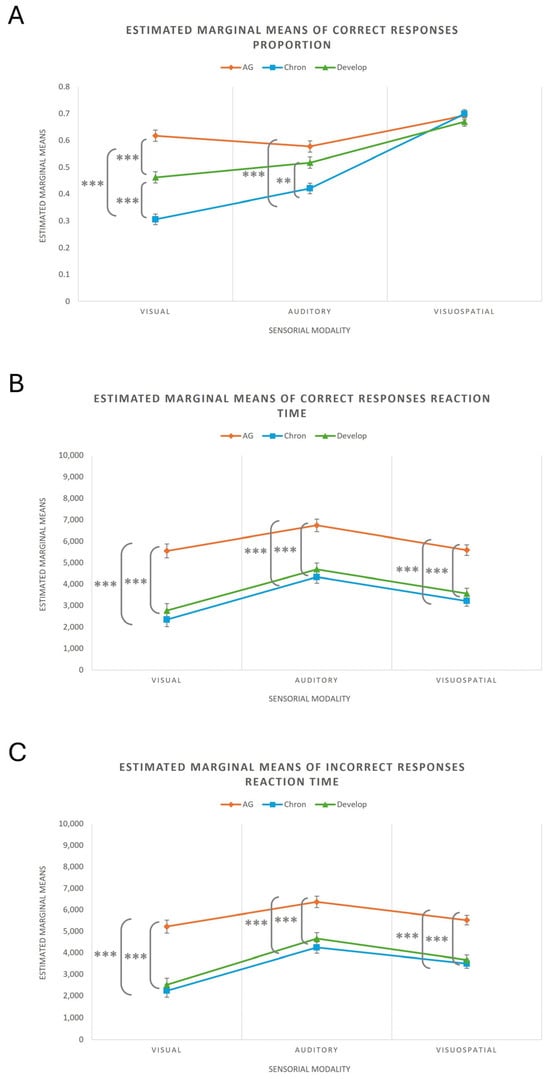When keeping the Sensory Modality constant, starting with the visual modality, significant differences were observed between the AG, Chronological, and Developmental groups in the average proportion of correct responses, with higher values in the AG, followed by the Developmental group, and lastly the Chronological CG (AG vs. Chronological: 95% CI [0.242, 0.383], p < 0.001; AG vs. Developmental: 95% CI [0.084, 0.227], p < 0.001; Chronological vs. Developmental: 95% CI [−0.228, −0.085], p < 0.001). Regarding the mean reaction time for correct responses, the AG again showed higher averages compared to the CG, with no statistically significant differences between the latter (AG vs. Chronological: 95% CI [2096.64, 4317.20], p < 0.001; AG vs. Developmental: 95% CI [1657.97, 3917.17], p < 0.001; Chronological vs. Developmental: 95% CI [−1539.66, 700.97], p = 1.000). The same pattern of results was observed for the mean reaction time for incorrect responses (AG vs. Chronological: 95% CI [1949.77, 4042.39], p < 0.001; AG vs. Developmental: 95% CI [1657.22, 3786.26], p < 0.001; Chronological vs. Developmental: 95% CI [−1330.11, 781.43], p = 1.000).
