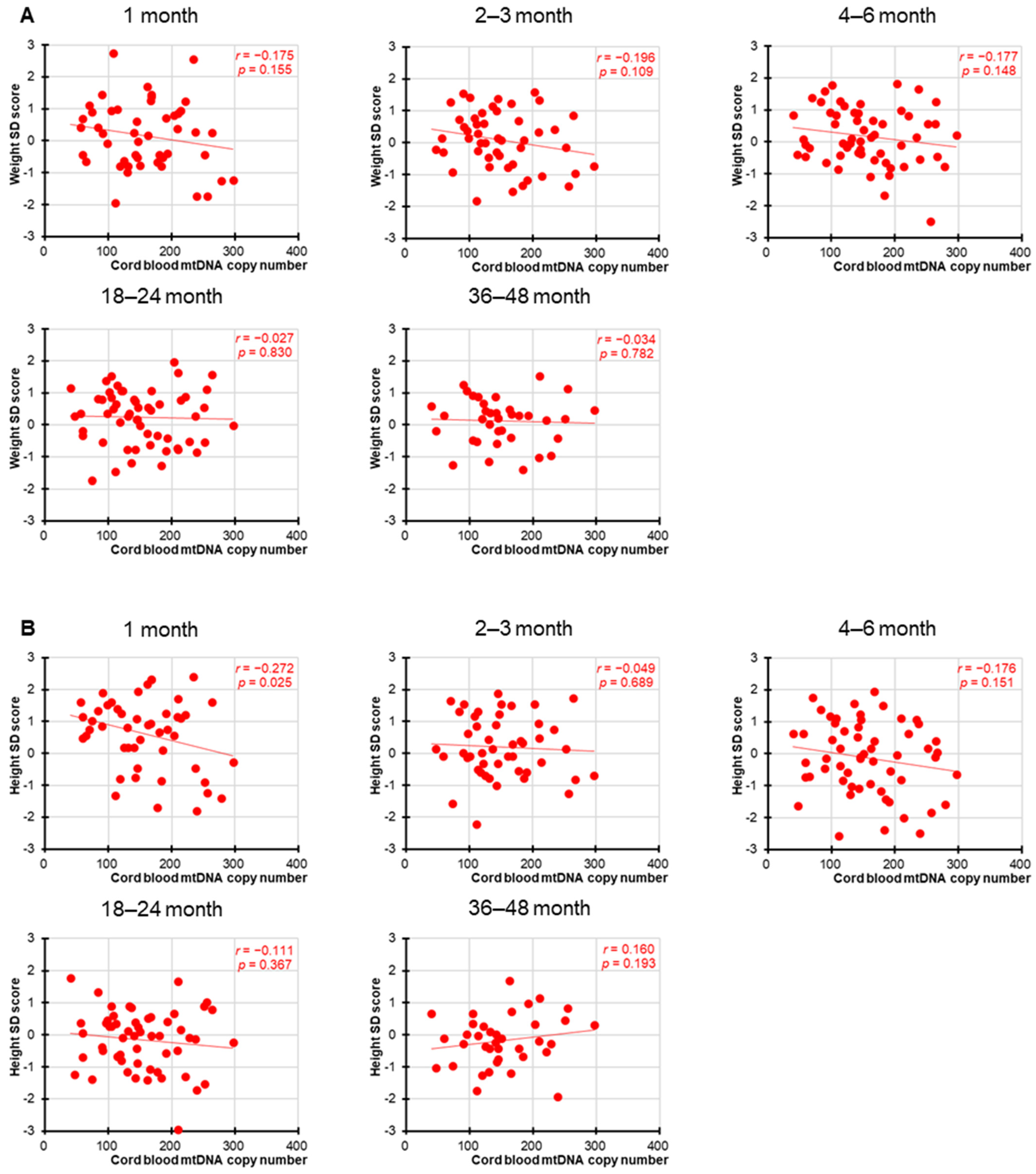 Figure 2. Correlation between male cord blood mtDNAcn and weight and height in infancy and toddlerhood. Correlation between male cord blood mtDNAcn and weight (A) and height (B) 1, 2–3, 4–6, 18–24, and 36–48 months after birth. The circles indicate individual sample values, and the straight line represents the correlation line. As 10 outcome measures were tested against one hypothesized predictor, to account for the increased possibility of type-I errors due to multiple testing, a Bonferroni-adjusted significance level of 0.005 (=0.05/10) was calculated.