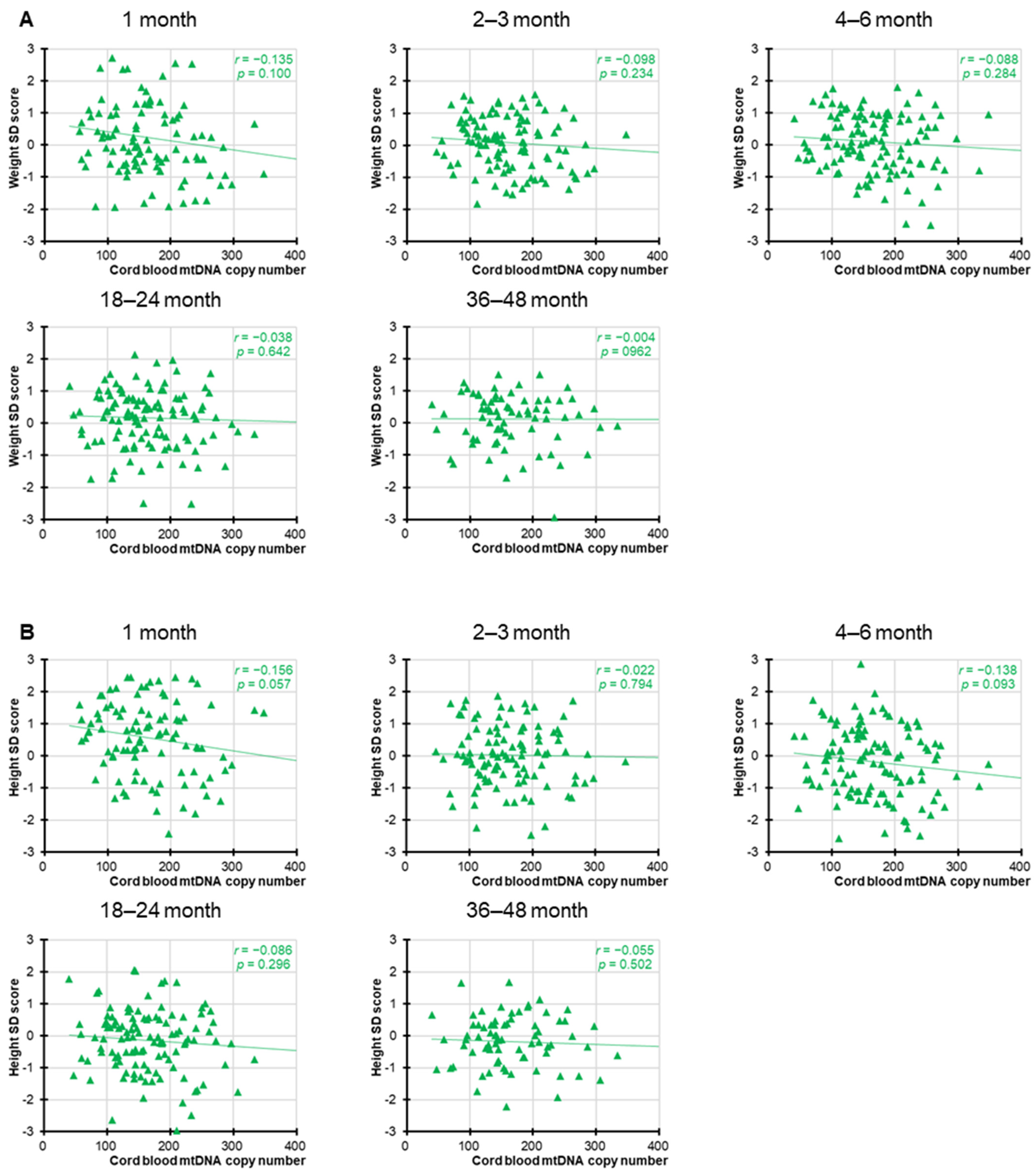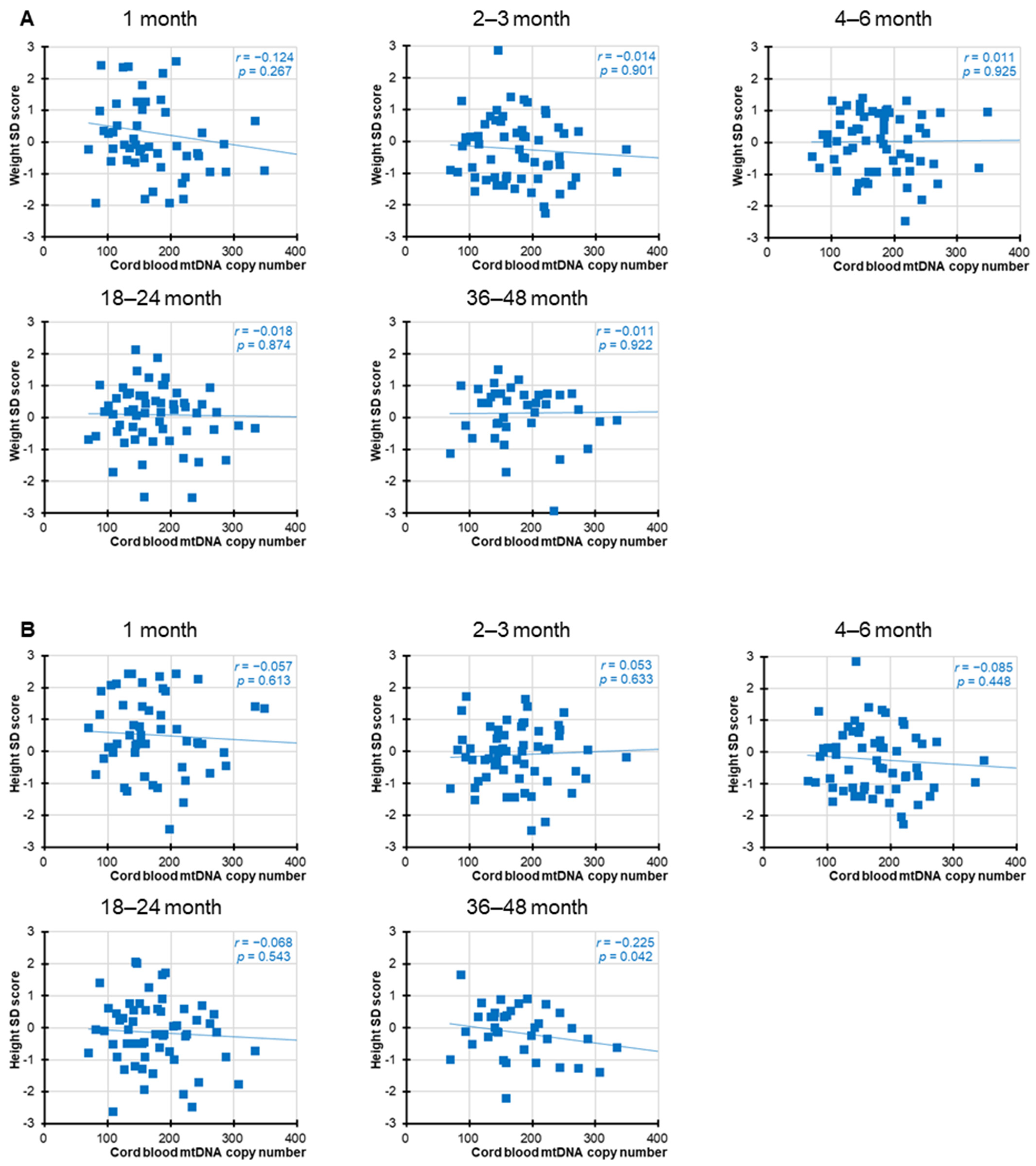 Significant negative correlations between cord blood mtDNAcn and birth parameters, including birth weight, length, and head circumference, were observed, as previously reported [19]. However, as shown in Figure 1 and Figure 2, in the present study, no statistically significant associations were found between cord blood mtDNAcn and the SD scores for weight or height at any of the postnatal time points for either sex. Nominally significant associations were observed for female height at 1 month (r = −0.272, p = 0.025) and male height at 36–48 months (r = −0.225, p = 0.042), but neither remained significant after Bonferroni correction (adjusted significance threshold p < 0.005). In addition, we performed a supplementary analysis combining both sexes into a single group (Figure 3). While this approach increased the overall statistical power, the results remained broadly consistent and showed no meaningful differences across analyses.
