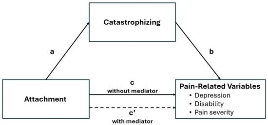 - Path ab indicates the indirect effect between attachment and pain-related variables (depression, disability, or symptom severity) through catastrophizing.