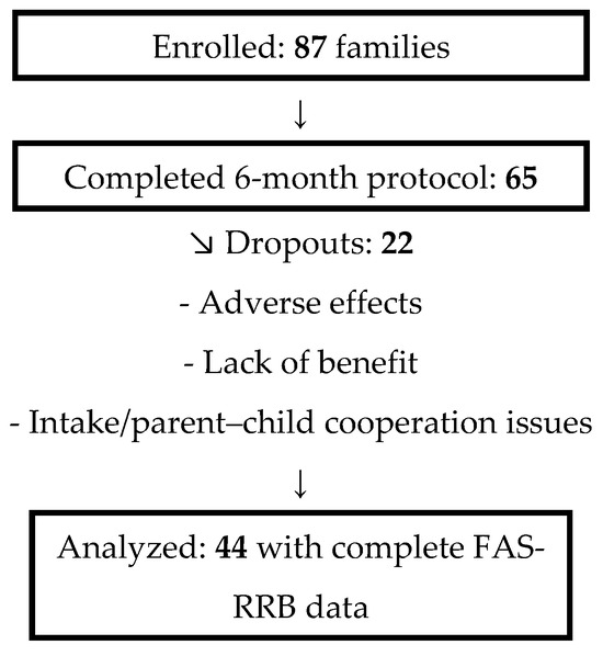 A total of 87 parents of autistic children (ages 5–12 years; M = 7.39, SD = 2.02; 71 boys [81.6%], 16 girls [18.4%]) were initially enrolled. Of these, 65 (74.7%) children completed the 6-month CBD-rich cannabis treatment. Twenty-two (25.3%) dropped out before completion, for reasons including adverse effects such as worsened functioning (n = 2), violence (n = 3), abdominal pain (n = 1), weight gain (n = 1), and sleep problems (n = 1); parental perception that the treatment was ineffective (n = 9); and intake difficulties or parent–child cooperation issues (n = 5) [23]. Among the completers, 44 provided complete FAS-RRB data at all three time points, forming the analytic sample. Participant flow is summarized in Figure 2.