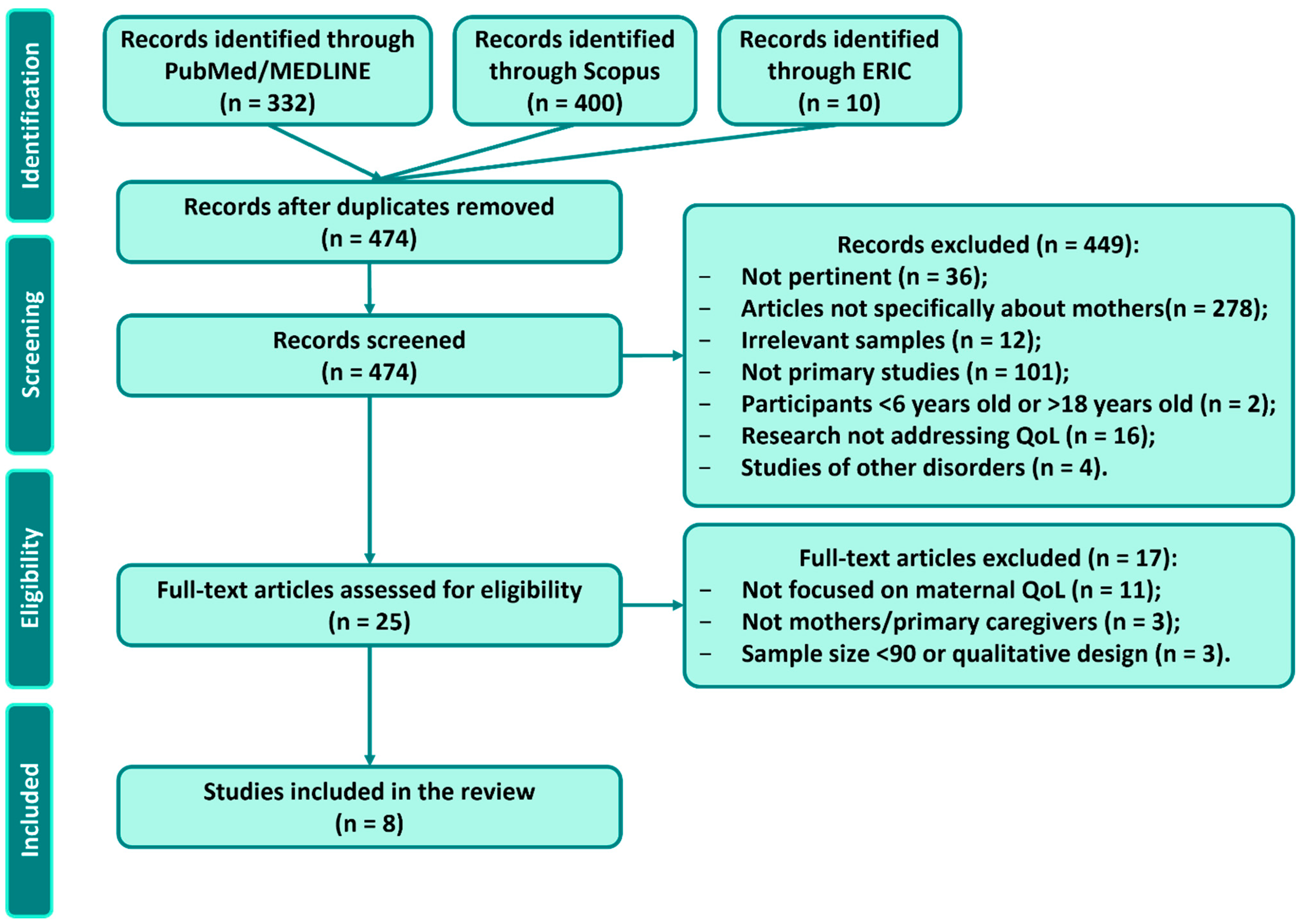 - Concept: The study quantitatively assessed the quality of life of the parent, using a validated QoL instrument or a quantitative measure of well-being/health-related QoL. Studies that only examined child outcomes or unrelated concepts (e.g., parenting practices or child treatment efficacy) were excluded.