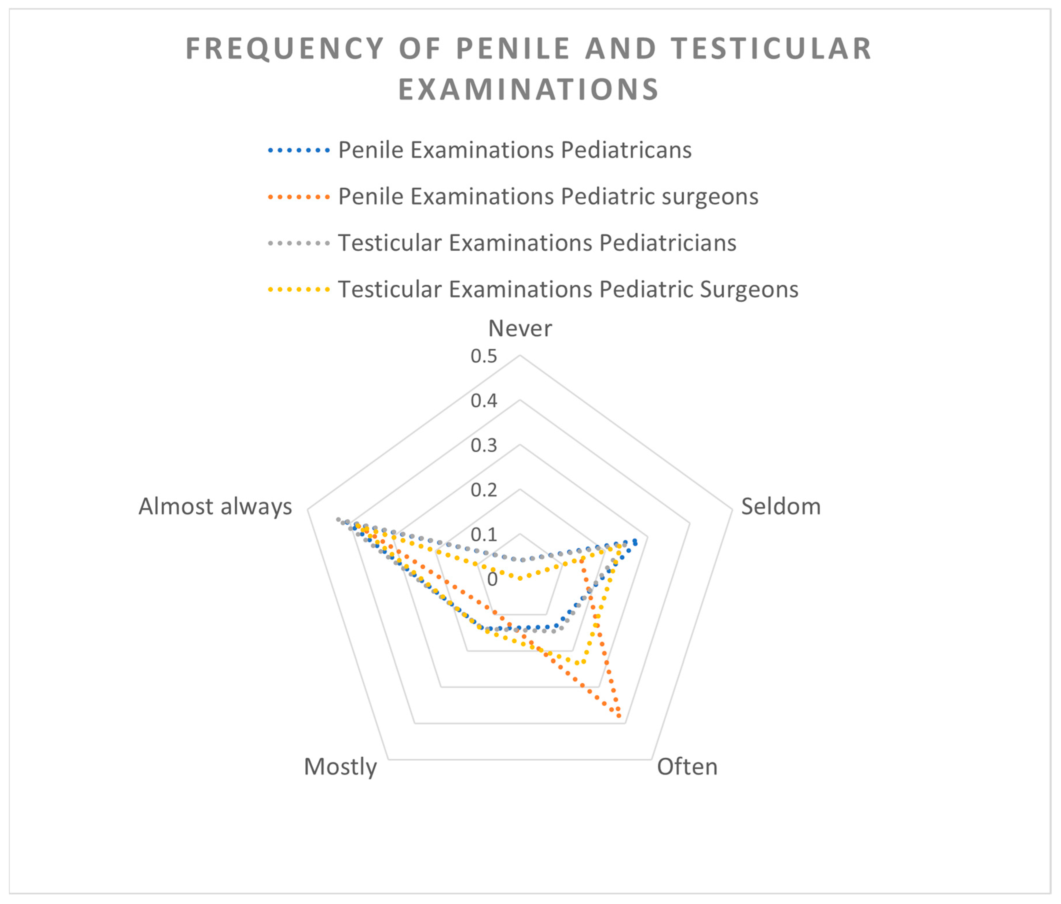 - Gerber, J.A.; Balasubramanian, A.; Jorgez, C.J.; Shukla, M.A.; Jacob, J.S.; Zhu, H.; Sheth, K.R.; Mittal, A.; Tu, D.D.; Koh, C.J.; et al. Do pediatricians routinely perform genitourinary examinations during well-child visits? A review from a large tertiary pediatric hospital. J. Pediatr. Urol. 2019, 15, 374.e1–374.e5. [Google Scholar] [CrossRef] [PubMed]
