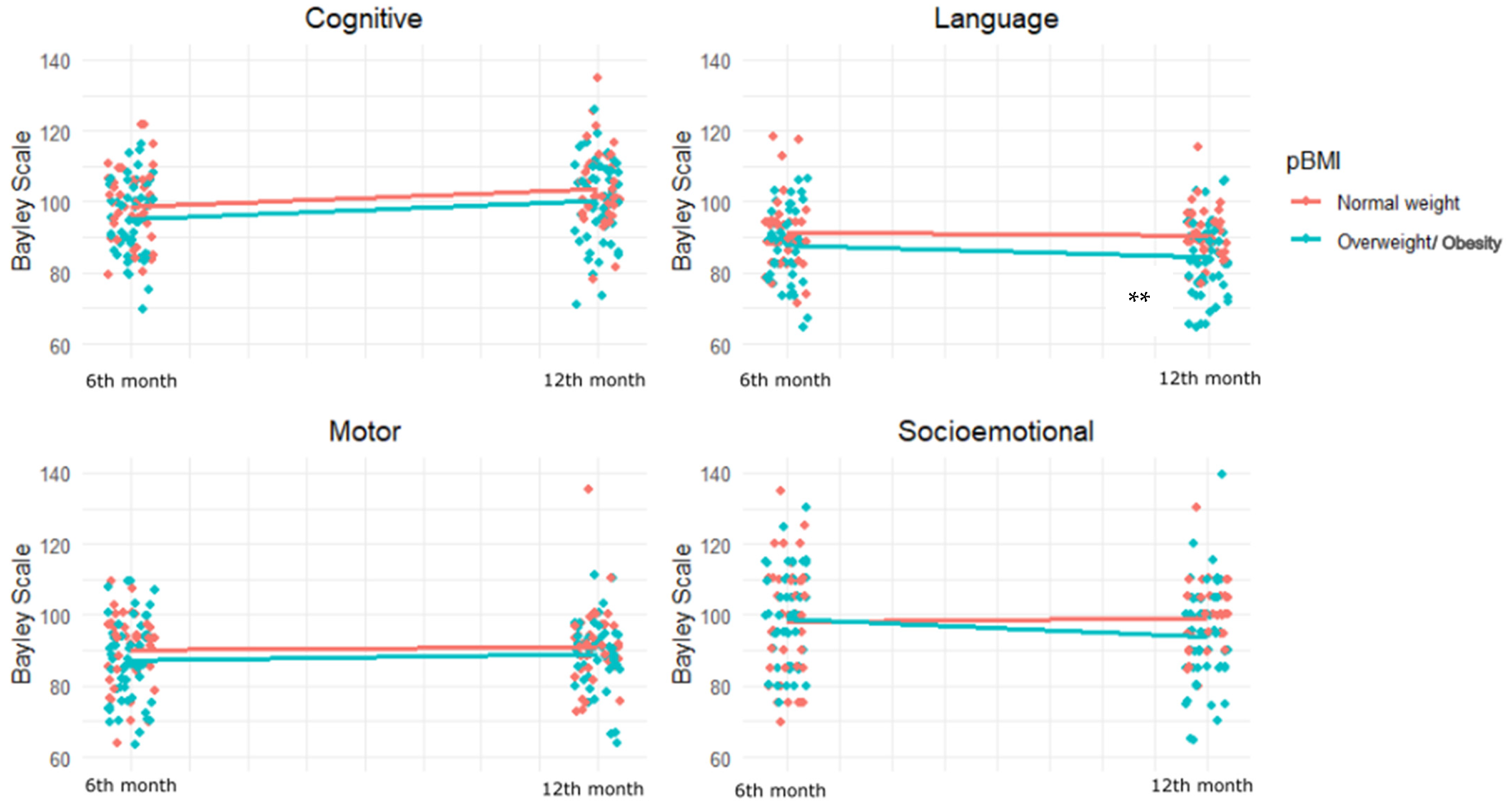 APA StyleCanul-Euan, A. A., Mendoza-Ortega, J. A., Solis-Paredes, J. M., Borboa-Olivares, H., Martínez-Medina, S., Hernández-Chávez, C., Gil-Martínez, G., Osorio-Valencia, E., Torres-Calapiz, M., Suárez-Rico, B. V., González-Ludlow, I., Rodríguez-Hernández, C., Rodríguez-Cano, A., Reyes-Muñoz, E., Camacho-Arroyo, I., Hernandez, S. L., Perichart-Perera, O., & Estrada-Gutierrez, G. (2025). Maternal Overweight and Obesity Alter Neurodevelopmental Trajectories During the First Year of Life: Findings from the OBESO Cohort. Children, 12(10), 1385. https://doi.org/10.3390/children12101385