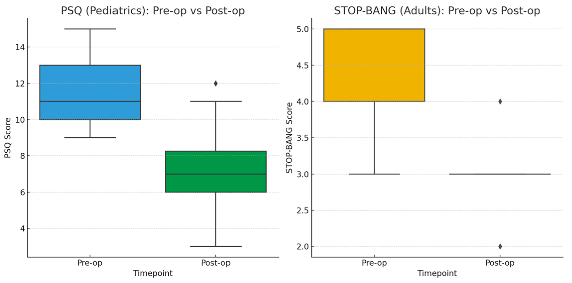 - All patients were followed postoperatively at 1 week, 1 month, and 2 months. Each visit included clinical examination, evaluation of symptom resolution, and documentation of complications such as bleeding, infection, or otalgia. Parents or patients were questioned regarding persistence or recurrence of nasal obstruction and otologic symptoms. Symptom severity was assessed at each visit using the Pediatric Sleep Questionnaire (PSQ) for patients younger than 18 years and the STOP-Bang questionnaire for patients aged 18 years or older. Both instruments were re-administered at the final 2-month follow-up to evaluate postoperative improvement in sleep-disordered breathing. Nasal endoscopy was not performed routinely, but was selectively conducted in patients with persistent symptoms to rule out residual or recurrent adenoid tissue.