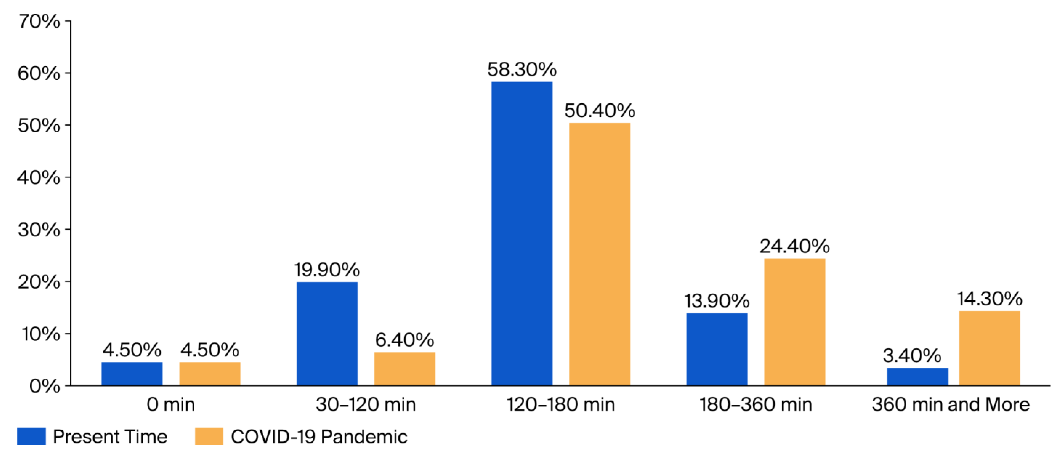 - During the COVID-19 pandemic, children’s daily screen time increased, with a marked rise observed in those using screens for more than 3 h per day.