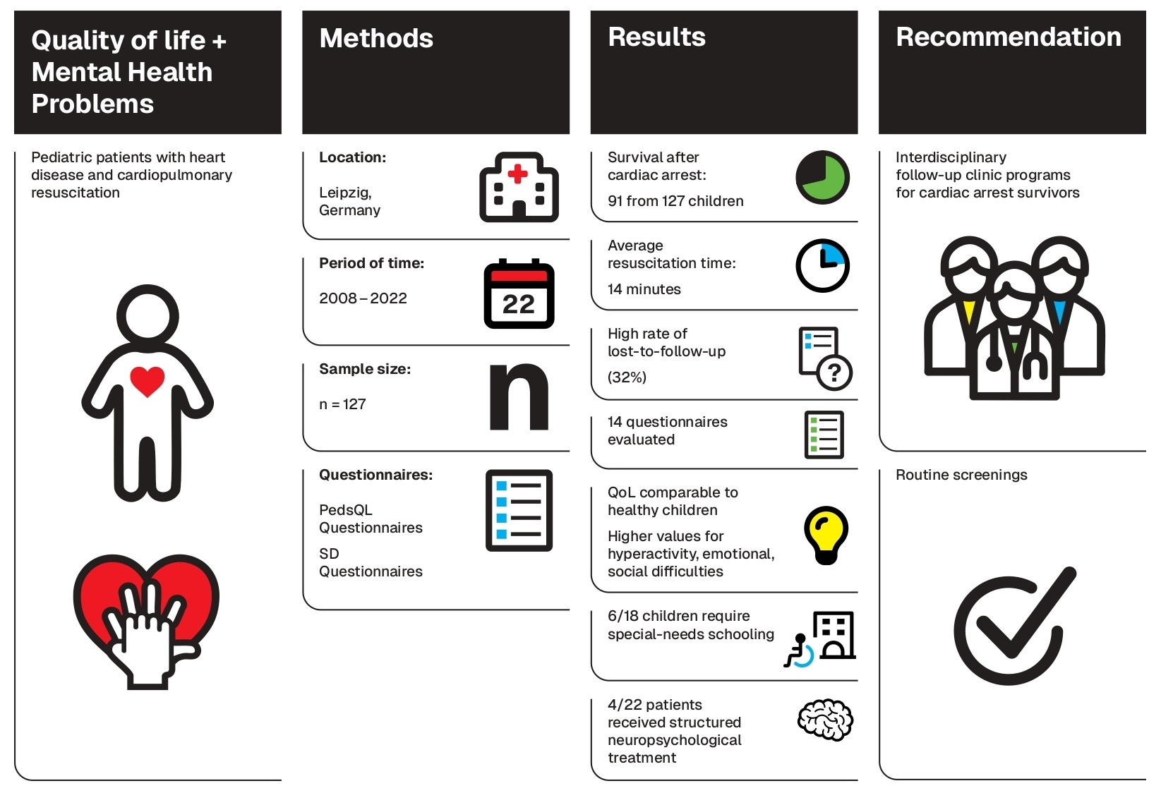 - These findings underscore the urgent need for long-term follow-up programs with routine neurodevelopmental and neuropsychological screening to support at-risk pediatric cardiac arrest survivors.