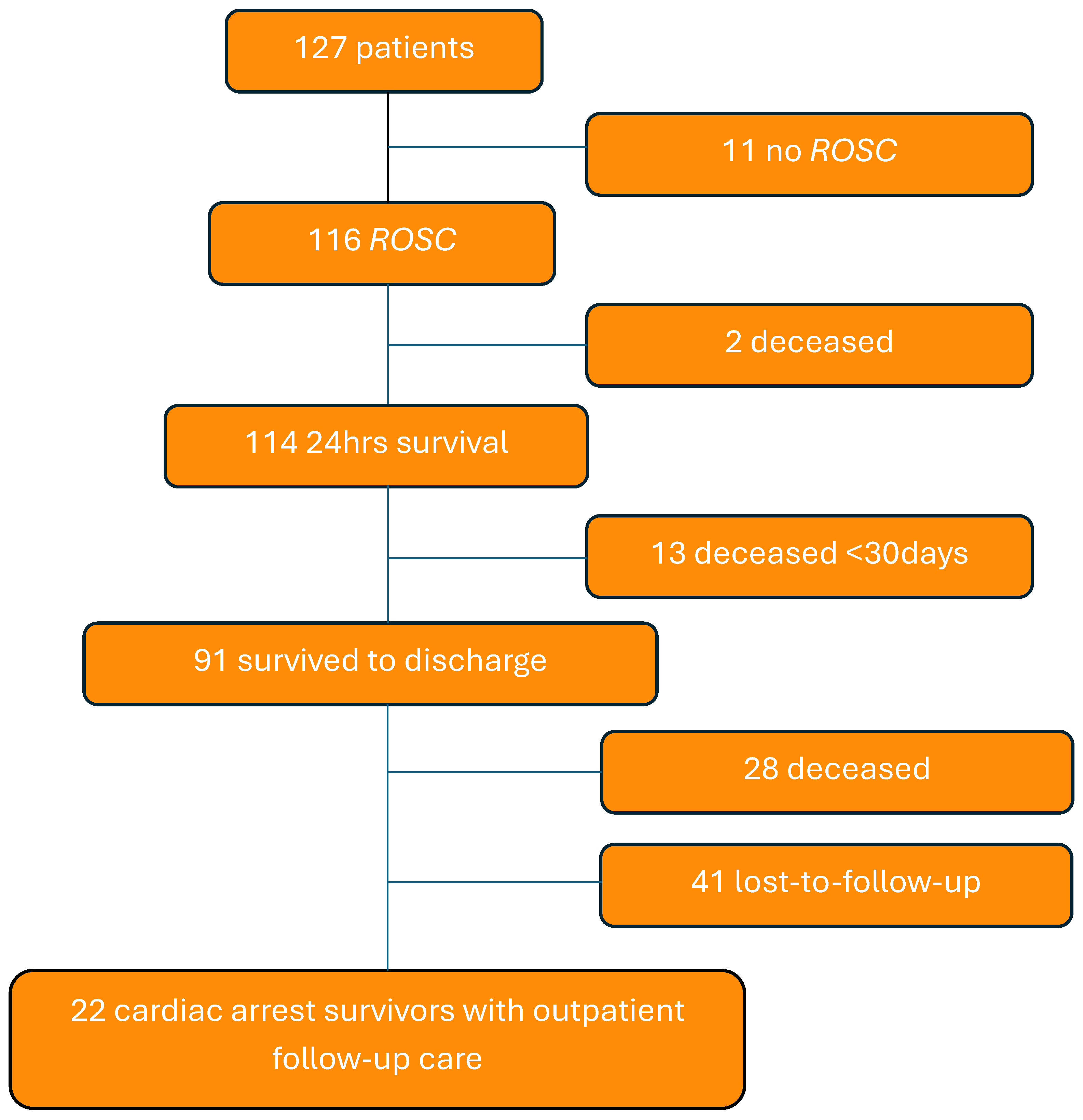 - Out of 127 pediatric cardiac arrest (CA) patients with heart disease, 72% survived to hospital discharge, and 22 are receiving follow-up care in an outpatient clinic.
