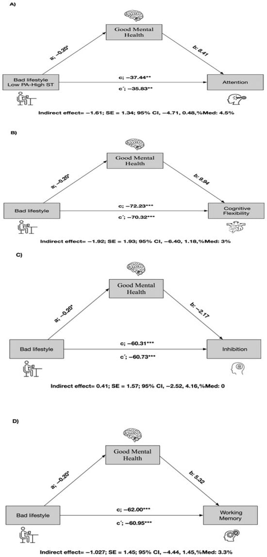 The mediation analysis results for the total sample (n = 625 children and adolescents) are shown in Figure 1. Good mental health emerged as a mediating variable in the relationship between a bad lifestyle and EFs. In the first regression step (a), a bad lifestyle was inversely related to mental health. In the second step (c’), the regression coefficient of a bad lifestyle in attention was also significant. In the third step, the potential mediator of mental health was positively related to the dependent variable (b); when both bad lifestyle and mental health were included in the model (c), the regression coefficient remained statistically significant (p < 0.001). Finally, the indirect effect confirmed that mental health was a partial mediator of attention (indirect effect −1.61; SE 1.34; 95% CI −4.71–0.48; and Med 4.5%) (see Figure 1A). Similarly, the potential mediator of mental health was positively related to the dependent variables (b) of cognitive flexibility (Figure 1B) and to working memory (Figure 1D). Finally, the indirect effect confirmed that mental health was a partial mediator of cognitive flexibility (indirect effect −1.92; SE 1.93; 95% CI −6.40–1.18; and Med 3%) and working memory (indirect effect −1.027; SE 1.45; 95% CI −4.44–1.45; and Med 3.3%). Mental health presented no mediation in the association between a bad lifestyle and the EF of flexibility.