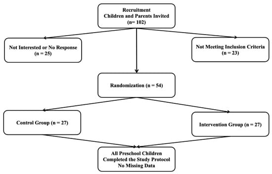 As illustrated in Figure 1, the eligibility of preschool children was assessed, with a total of 102 children evaluated for participation in the study. Among them, 25 parents refused to allow their children to participate, and 23 children did not meet the inclusion criteria. In total, 54 children (26 boys and 28 girls) with a mean age of 3.87 ± 0.47 years were included in the study. The children were randomly assigned to either the experimental group (27 children; 14 boys) or the control group (27 children; 12 boys) using a computer-generated random number list.