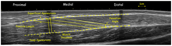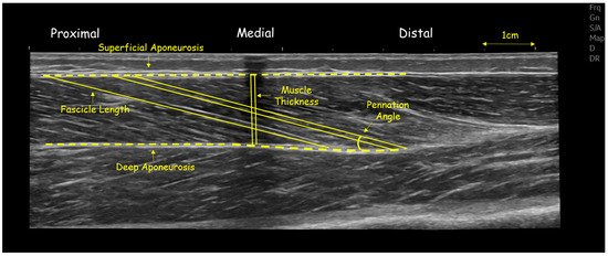 Skeletal muscle architecture is defined as the arrangement of muscle fibers within a muscle relative to the axis of force generation and is a primer determinant of muscle function [1]. Key architectural characteristics are fascicle length and angle and muscle thickness, all of which affect force–length and force–velocity relationships [2,3,4]. For example, increases in pennation angle and muscle thickness are generally associated with greater force-producing capacity via increases in physiological cross-sectional area, whereas longer fascicles relate more directly to higher contraction velocity and potential power output [5,6].