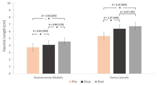 Differences between the three maturity groups for gastrocnemius medialis (left) and vastus lateralis (right) fascicle length and pairwise comparisons (Cohen’s d). * p < 0.05.