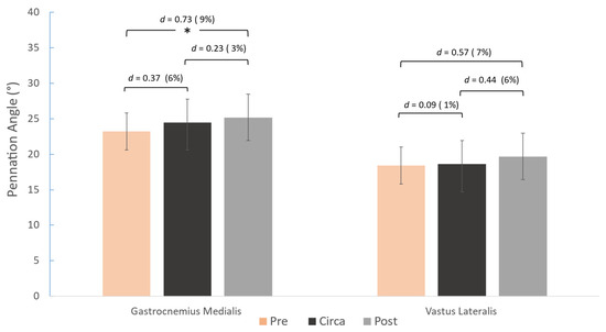 Differences between the three maturity groups for gastrocnemius medialis (left) and vastus lateralis (right) pennation angle and pairwise comparisons (Cohen’s d). * p < 0.05.