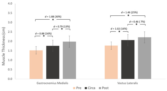 Gastrocnemius medialis and vastus lateralis TH was greater from pre- to circa-PHV (p < 0.001 and p < 0.001, respectively). It was also greater in pre- compared to post-PHV athletes (p = 0.001 and p = 0.001, respectively) for both muscles.