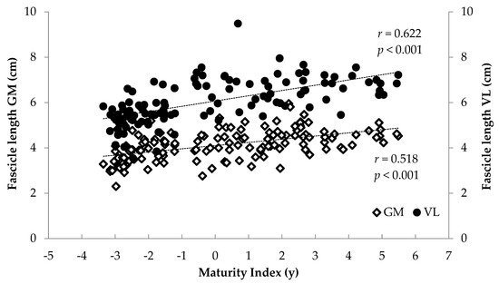 Association between athletes’ maturity index and gastrocnemius medialis (GM) and vastus lateralis (VL) fascicle length.