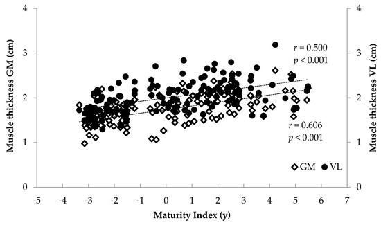 Association between athletes’ maturity index and gastrocnemius medialis (GM) and vastus lateralis (VL) muscle thickness.