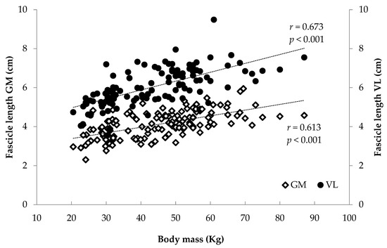 Association between athletes’ body mass and gastrocnemius medialis (GM) and vastus lateralis (VL) fascicle length.