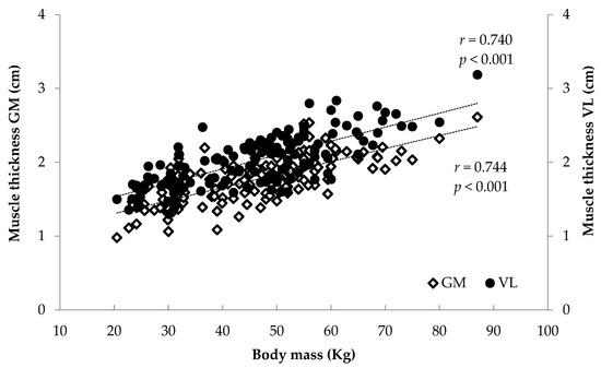 Association between athletes’ body mass and gastrocnemius medialis (GM) and vastus lateralis (VL) muscle thickness.