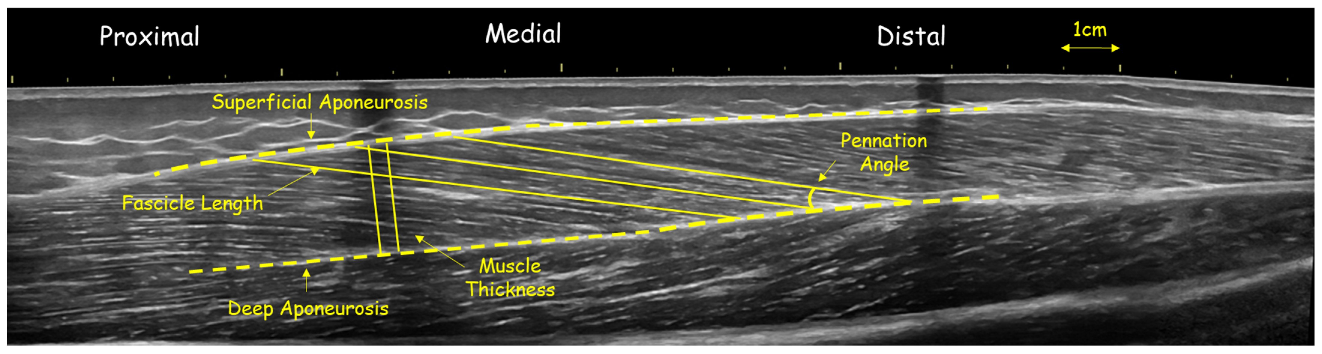 - Noorkoiv, M.; Stavnsbo, A.; Aagaard, P.; Blazevich, A.J. In vivo assessment of muscle fascicle length by extended field-of-view ultrasonography. J. Appl. Physiol. 2010, 109, 1974–1979. [Google Scholar] [CrossRef]