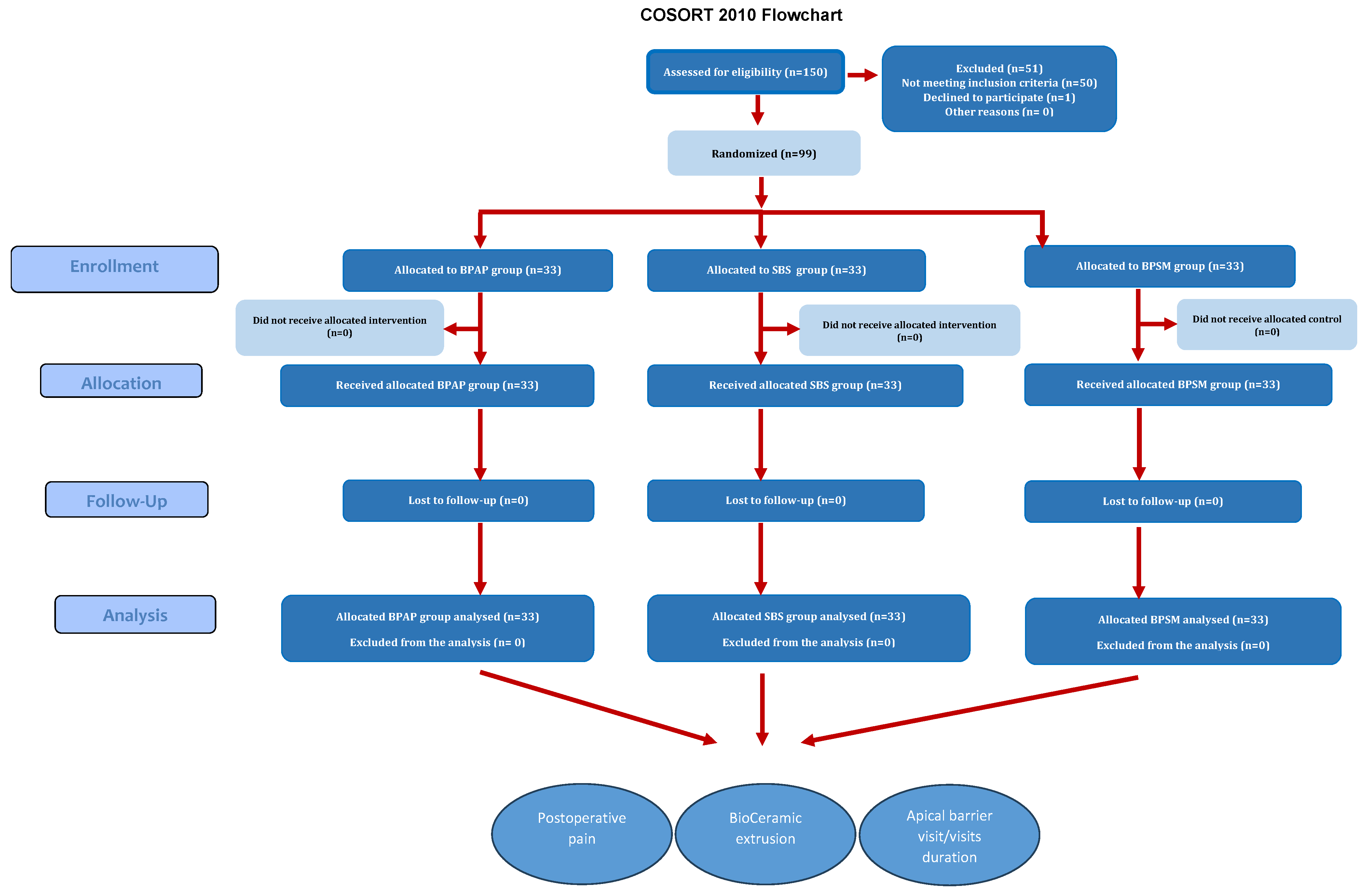 This trial directly compared three distinct application methods: the Bioceramic Putty Apical Plugs (BPAP) method, the Single Cone Gutta-percha with BioCeramic Sealer (SBS) method, and the BioCeramic Putty and Sealer Mixture (BPSM) method, and also investigated patient-related factors such as behavior, apical size, and preoperative pain, which may impact treatment outcomes. The null hypothesis (A) stated that the three apical barrier methods were equivalent in terms of postoperative pain. The null hypothesis (B) assumed that the methods would be comparable in terms of the incidence of bioceramic extrusion. Finally, the null hypothesis (C) proposed that the methods would not differ in terms of procedure duration.