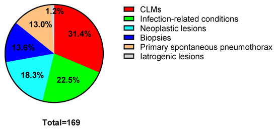 The indications for surgery are presented in Figure 1. The most common indication was CLMs (31.4%, 53 patients in total), while 116 patients underwent surgery for acquired lesions. No iatrogenic lesions requiring lung resection were observed after 2015. There were 94 patients less than 8 years of age: 50 (53.2%) had CLMs, whereas 44 (46.8%) had acquired lesions. There were 75 patients over 8 years of age; 3 had CLMs (4.0%), and the other 72 had acquired lesions (96.0%).