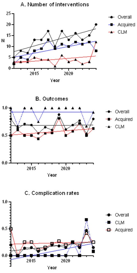 Linear regression: (A) Number of procedures performed; (B) Outcomes; (C) Complication rates (including all intra- and post-operative events). Each parameter calculated for all surgical indications, acquired lesions, and CLMs.
