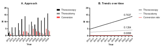 (A) Interleaved bars of number of thoracotomies, thoracoscopies and converted thoracoscopies. (B) Linear regression for trends over time.