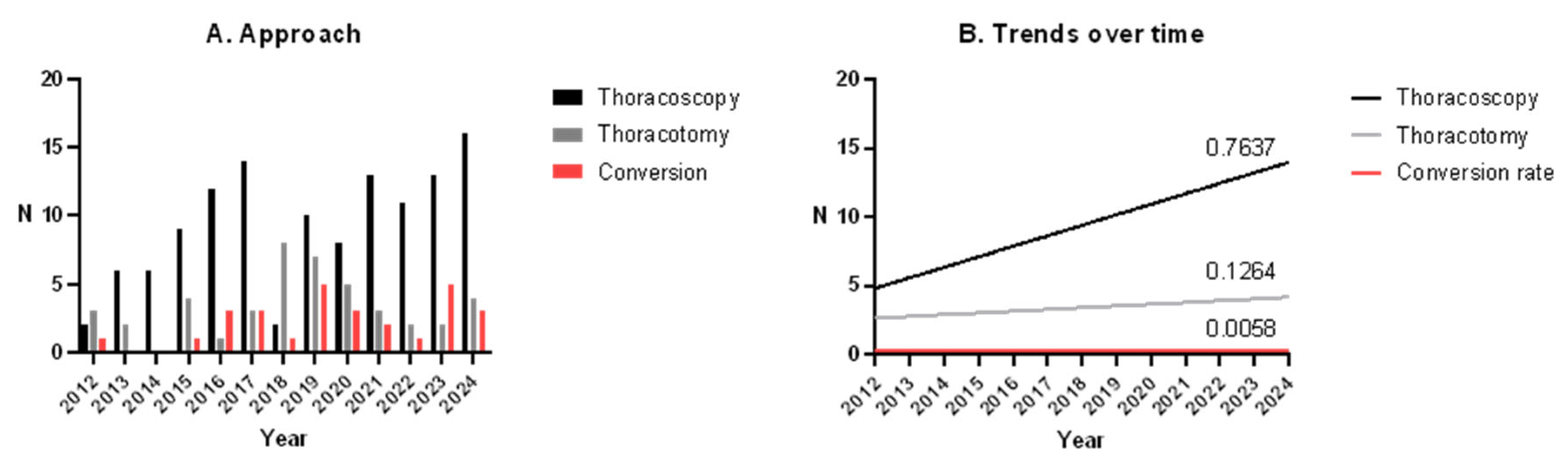3.2. Thoracoscopy vs. Thoracotomy