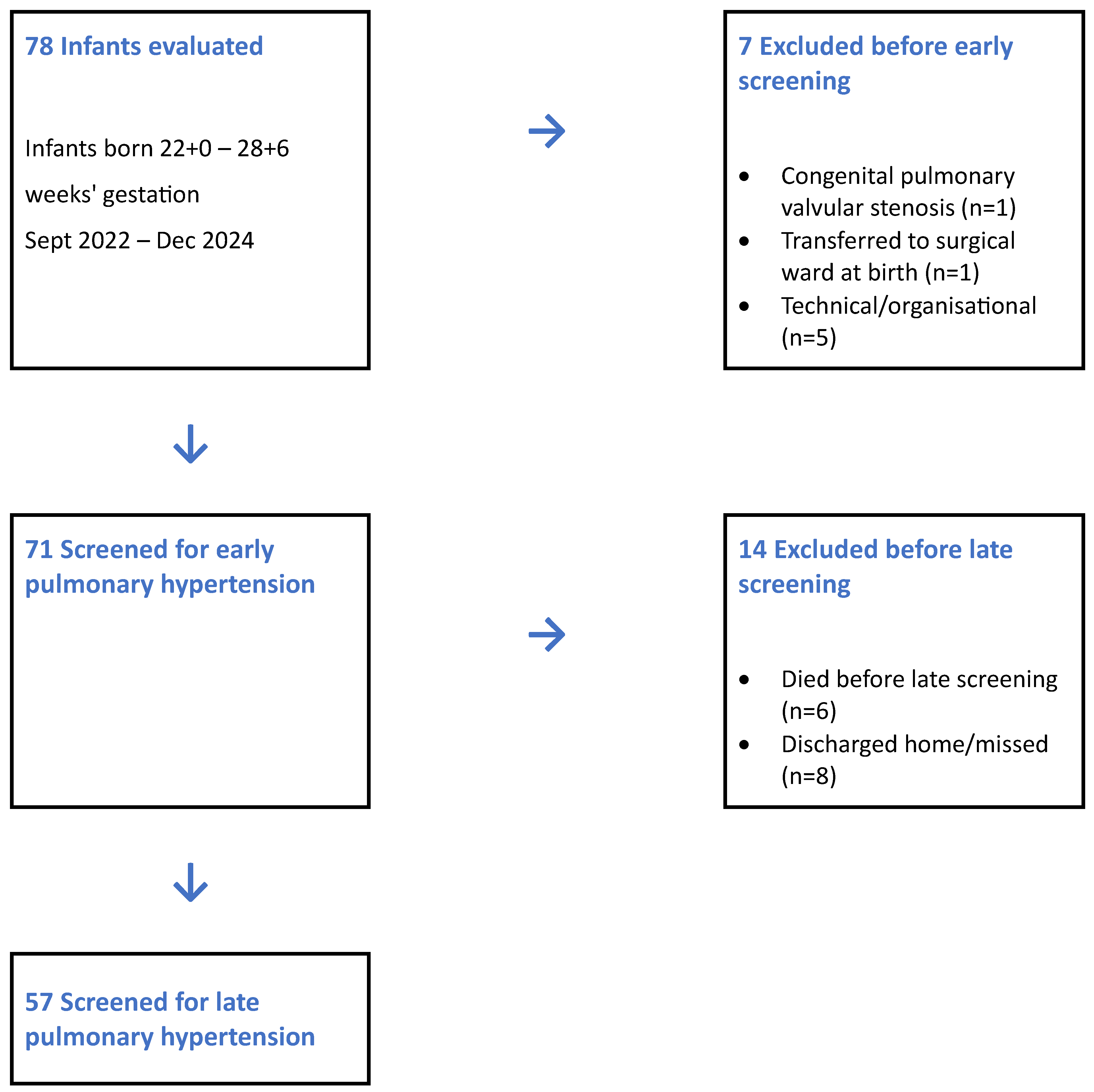 - Mullaly, R.; Smith, A.; Murphy, C.; Armstrong, S.; Franklin, O.; McCallion, N.; El-Khuffash, A. Characteristics and outcomes of preterm infants with early pulmonary hypertension. J. Perinatol. 2025, 45, 1395–1402. [Google Scholar] [CrossRef] [PubMed] [PubMed Central]